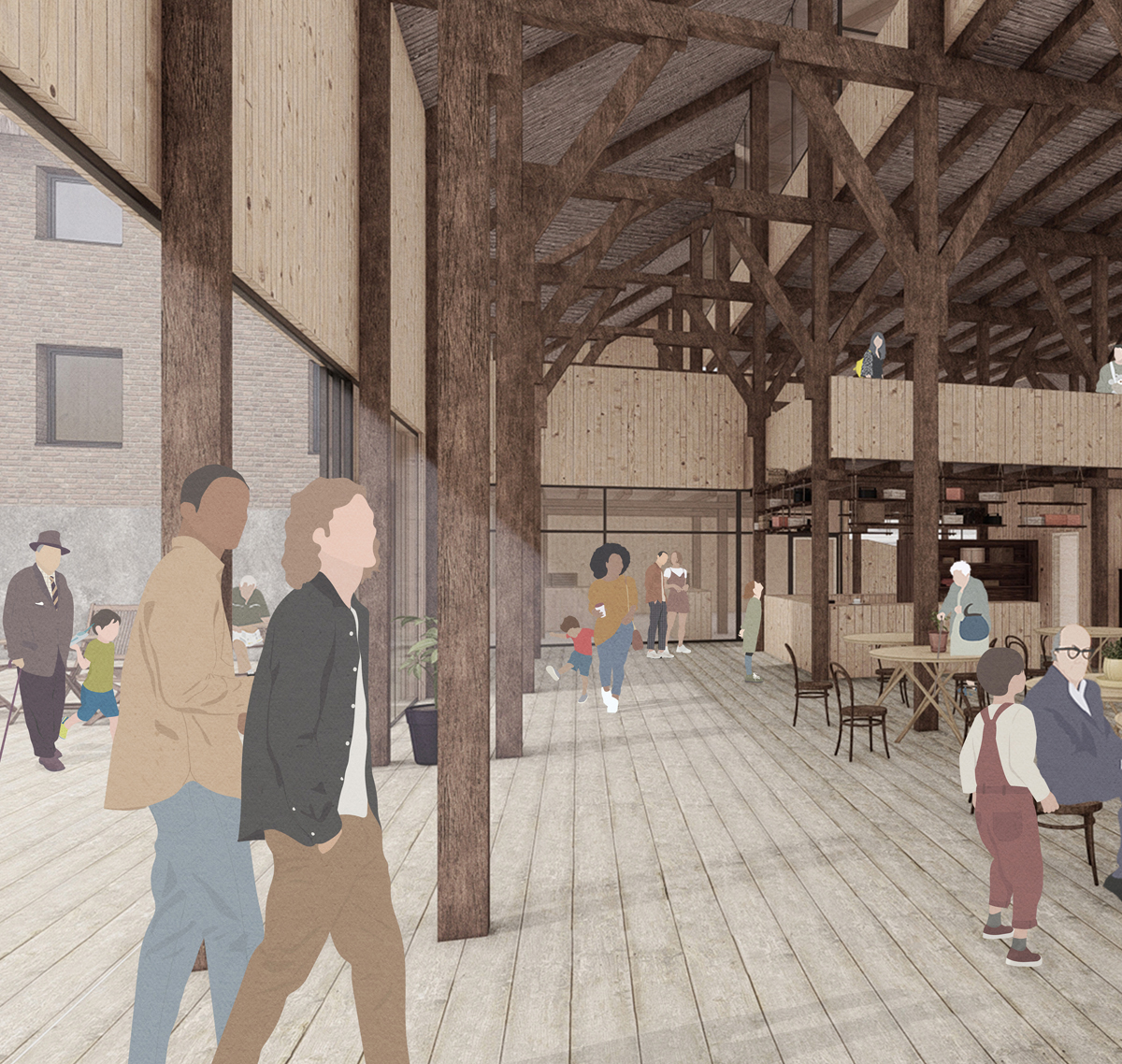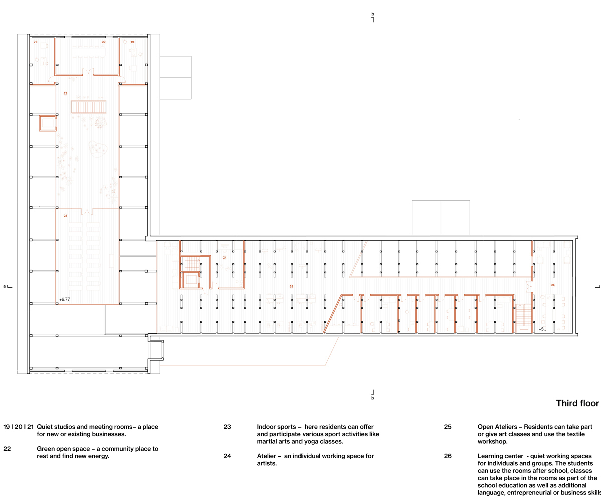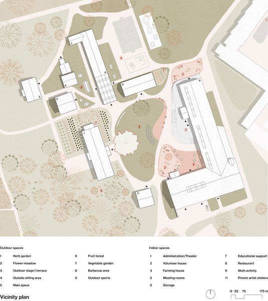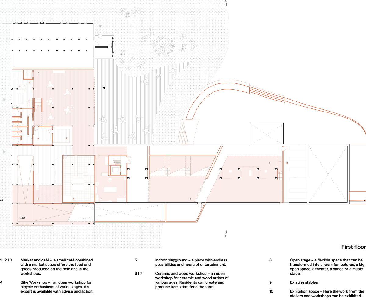 To strengthen the neighborhood's identity as a former agriculture and forestry area, new permaculture hubs are created. The aim is to form a starting point from where it allows people to try out, react to the outcomes and gives the opportunity to slowly grow and spread throughout the neighborhood. People can come together, experience a sense of community and share their everyday lives. In addition to the permaculture development, the new community center also hosts several creative activities and social meeting places.