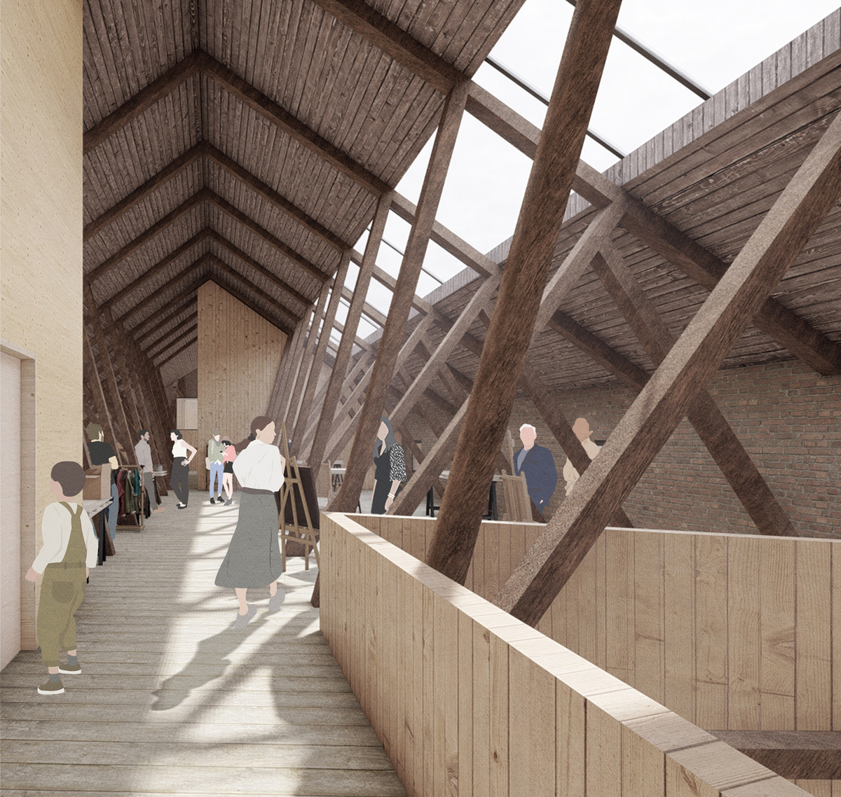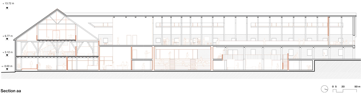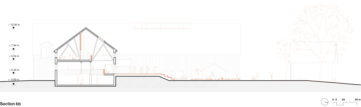 The Tveiten Gård is reconsidered as a whole, following the principal of a circular economy, where all the activities, spread in the diferent buildings, give and take from each other. Therefore, the new greenhouse creates the link with the enlarged permaculture area, the restaurant and the market. The diferent working and rental spaces, workshops and classes, bring new opportunities for local entrepreneurs and inhabitants while showing the possibilities of an efervescent space, where all user groups comes together - children, youth