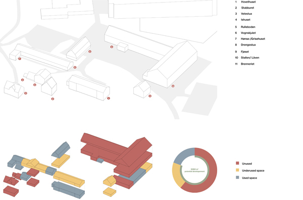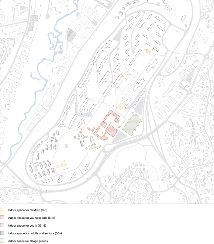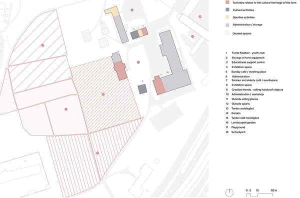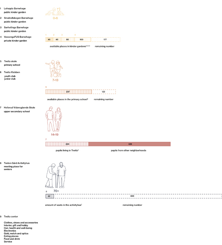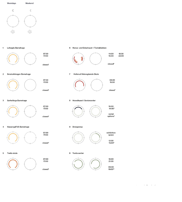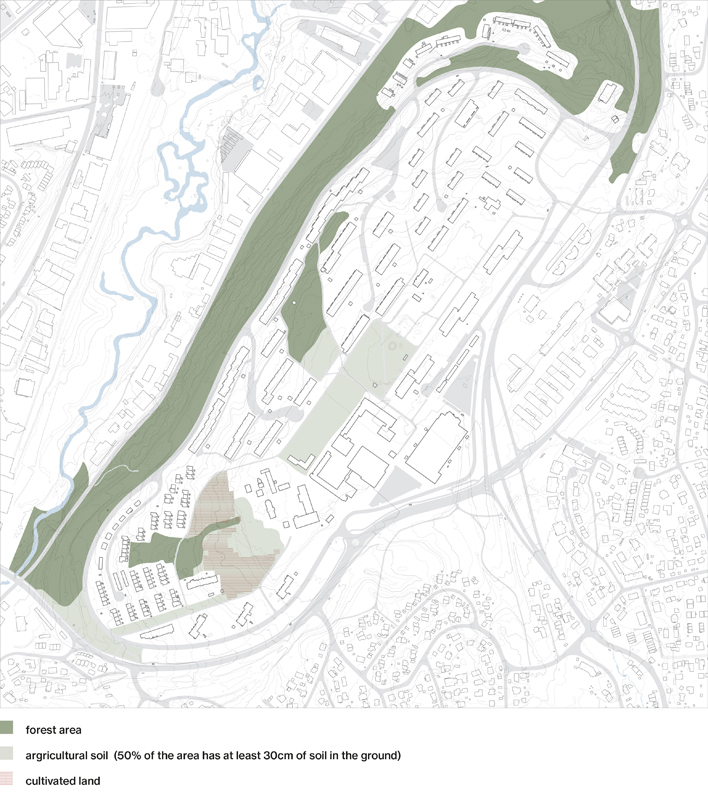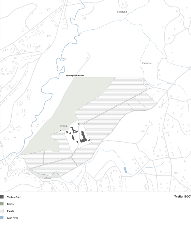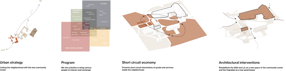 As the farm is located in the western part of Tveita, the urban strategy is developed around a journey of emerging agriculture hubs, linking the diferent actual educational institutions, social activities and forest areas with the future community center, developed in the Tveiten Gård.