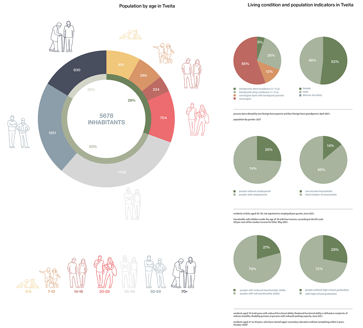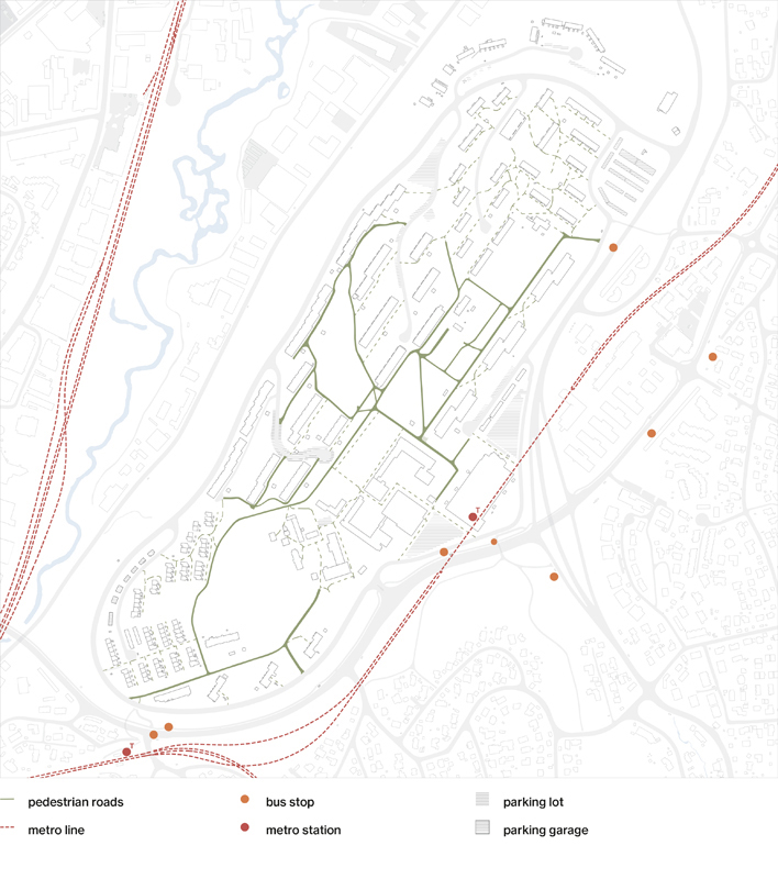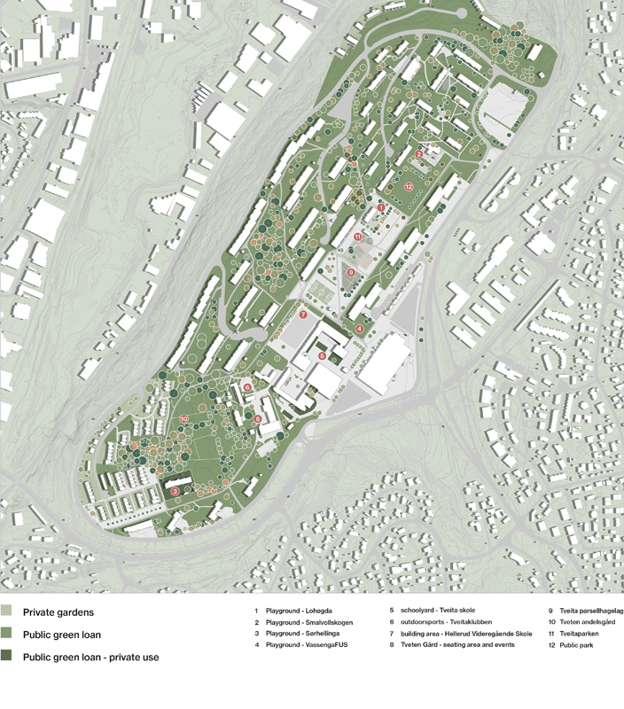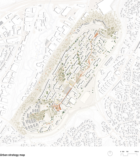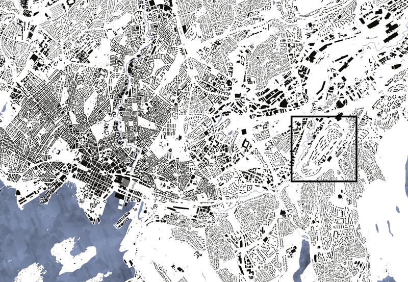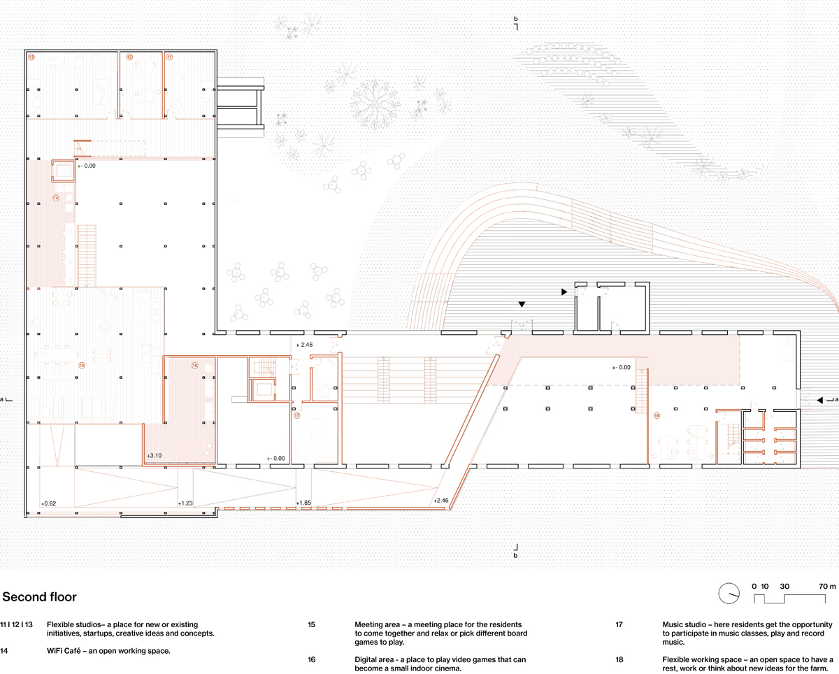 As the farm is located in the western part of Tveita, the urban strategy is developed around a journey of emerging agriculture hubs, linking the diferent actual educational institutions, social activities and forest areas with the future community center, developed in the Tveiten Gård.